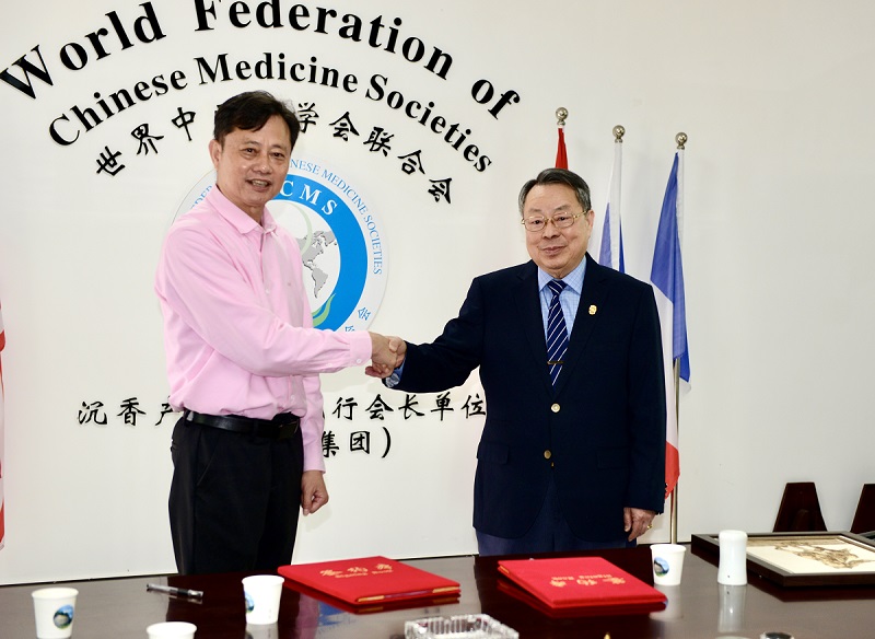 茂名市电白区沉香协会会长汪科元和世界华文大众传播媒体协会主席吴治欧签署电子商城合作协议。