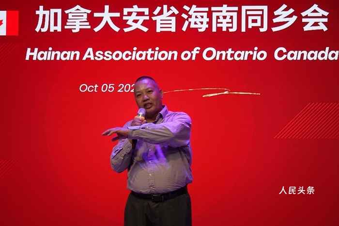 加拿大海南排球俱乐部负责人曾广坚也上台发言,介绍了俱乐部的活动和愿景 。 他说:“ 排球是海南人的传统运动,我们要在加拿大继续传承和发展 。 感谢大家一路支持 。”